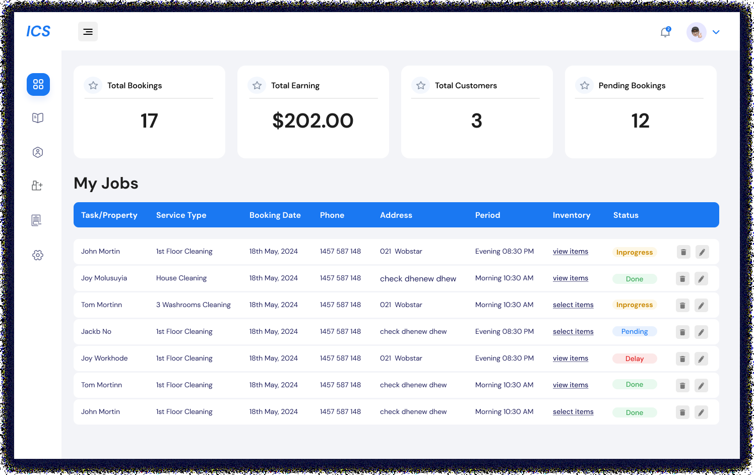 \ICSM offers real-time task management, inventory tracking, role-based dashboards, and video monitoring for property managers, cleaning teams, and clients. The platform ensures operational efficiency, transparency, and accountability in cleaning services.